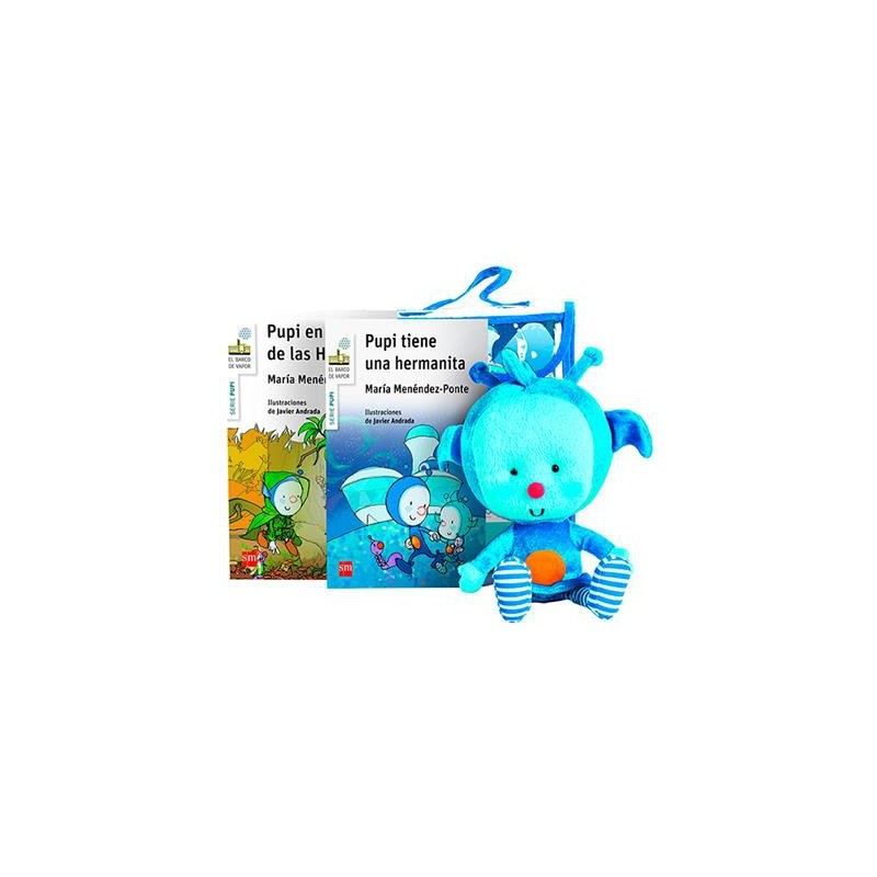 El nuevo pack de Pompita contiene dos libros: Pupi tiene una hermanita y Pupi en el País de las Hadas y un muñeco de Pompita, la tierna hermanita de Pupi.